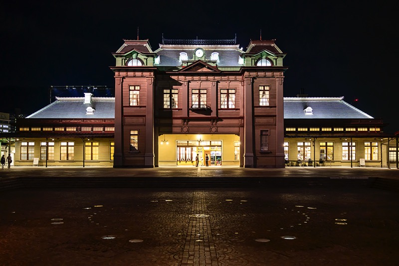 北九州市門司区西海岸に位置する九州旅客鉄道(JR九州)鹿児島本線の起点駅で、1914年(大正3年)に創建。1988年には鉄道駅として初めて国重要文化財に指定された。2012年から行われた長期保存修理工事を経て、2019年に大正時代の姿に復原。駅舎は木造二階建て、ネオ・ルネサンス様式が用いられ、左右対称の特徴的外観を持つ。駅舎内には九州の鉄道の起点を表す「ゼロマイル標」や門司港に帰り着いた引揚者や復員兵が安堵の思いで喉を潤した「帰り水」、戦時中の金属供出から逃れた「幸運の手水鉢」などの歴史的な展示物が残り、当時の文化を現代に伝えている。駅舎の横には関門連絡船就航当時に駅から桟橋までの約100mを結んでいた「関門連絡船通路跡」が残存。夜になると駅舎が暖色系の明かりで照らされ、大正ロマンの風情溢れる駅舎が駅前広場の噴水と共に浮かび上がる。そして、駅舎のライトアップに対して駅前を行き交う人々のシルエットが加わり、映画のワンシーンのような幻想的な雰囲気を創出している。本認定では、ドラマチックでフォトジェニックな魅力のみならず、歴史や文化的価値を現代の光で照らすというライトアップの本質を追求した作品として評価。門司港レトロ地区の観光拠点としてはもちろん、近隣の門司港エリア建築群のライトアップ、門司港レトロ展望室、和布刈公園第二展望台などの日本夜景遺産も併せて楽しみたい。